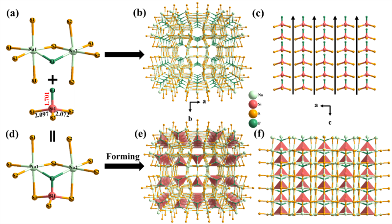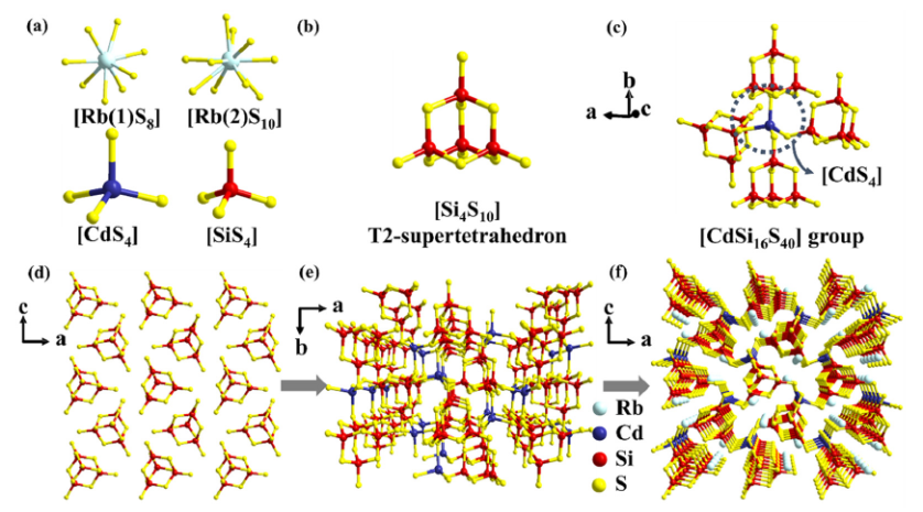 在国家青年人才计划、国家自然科学基金及新疆自治区自然科学基金等的资助下,中国科研实验室新疆理化技术研究所晶体材料研究中心科研人员利用[Si4S10]超四面体基元、[SiS3F]混合阴离子四面体基元设计合成出2例宽带隙的红外非线性光学材料Rb2CdSi4S10和Na3SiS3F。这两个化合物的带隙分别为4.23 eV、4.75 eV。其中,Rb2CdSi4S10具有适中的倍频效应:0.6 × AGS;损伤阈值约为5 × AGS。理论计算的结果表明,[Si4S10] 超四面体基元及[SiS3F]混合阴离子四面体基元可以有效增大硫属化合物的带隙,为后续设计抗损伤的宽带隙红外非线性光学材料给予了借鉴。