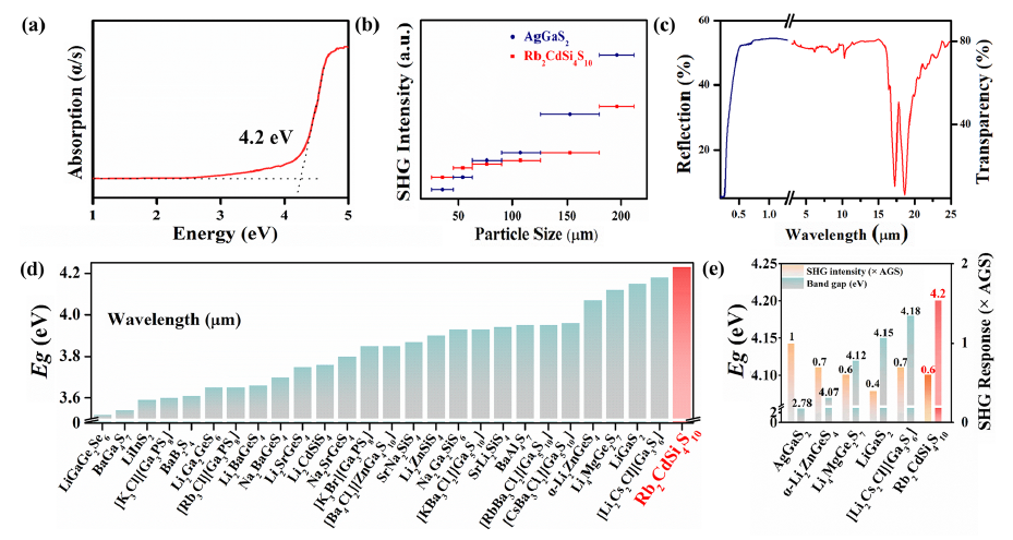 (a)光学带隙;(b)Rb2CdSi4S10和AgGaS2在2.09 μm激光下不同颗粒度的倍频效应;(c)光学透过;(d)带隙性能对比