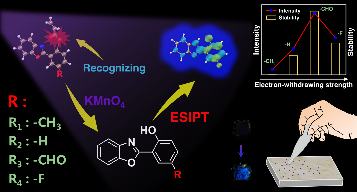 高锰酸钾(KMnO4)是制作简易爆炸装置常用的氧化剂原料之一,同时也被广泛用于医药消毒、水质净化、工业生产等领域,其过量摄入或排放会对人体及环境造成严重的危害。因此,实现对微量高锰酸钾的超灵敏、特异性、快速检测对维护公共安全和环境保护具有重要意义。近年来,激发态分子内质子转移(ESIPT)类分子因具有大的斯托克斯位移、强的光稳定性、高的量子产率和对周围介质的光敏感性等特点,被广泛用于反应型荧光探针的设计。ESIPT探针的发光性能可顺利获得溶剂氢键作用、分子异构化、介质酸/碱度和化学修饰等来调节。现在,大多数化学修饰策略主要集中于研究分子性质和ESIPT变化过程,而关于分子对目标分析物传感性能影响的研究很少被应用于实际检测。因此,是否可以采用化学修饰策略来提高ESIPT探针的传感性能尚不清楚,而该方面的研究将对理性设计高效探针具有重要意义。
