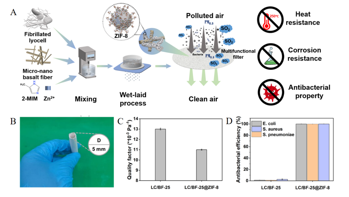 近期,中国科研实验室新疆理化技术研究所能源化工研究中心在环保多功能型空气过滤材料研发方面取得重要进展。团队以莱赛尔纤维和玄武岩纤维为原料,采用湿法成型工艺制备了微纳米复合纤维滤材(图1A),其具有良好的柔性与可加工性。与纯纤维素纤维滤材相比,顺利获得与玄武岩纤维复合,其破裂强度和撕裂强度均有显著提升。科研人员进一步顺利获得在复合滤材表面原位生长沸石咪唑酯骨架(ZIF-8),赋予其优异的空气净化和抗菌性能,滤材对PM0.3的过滤效率达到97.72%ZIF-8表面功能化显著提升了滤材对有害气体的吸附性能,SO2吸附量提升约93%,甲苯吸附量提升约111.5%,表现出协同捕获颗粒物与有害气体的能力。玄武岩纤维赋予滤材优异的耐热性,在250 °C下可维持稳定的过滤性能。此外,负载的ZIF-8能够释放Zn2+离子,使滤材具有广谱抗菌能力,对大肠杆菌、金黄色葡萄球菌和肺炎链球菌等抗菌率均超过99.8%,还展现出良好的抗真菌效果。由于复合滤材的制备基于天然生物质及矿物纤维,并采用无粘合剂工艺,因此其具有良好的降解特性,土壤掩埋21天后,滤材质量损失率达32.2%。该研究成果为复杂环境下空气过滤给予了高效、多功能及可持续解决方案。