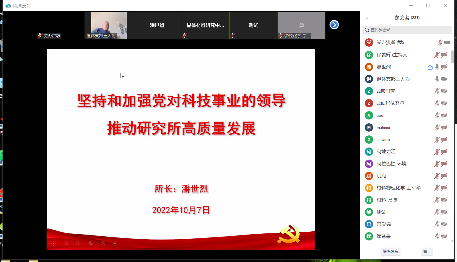 为热烈庆祝中华人民共和国创建73周年,喜迎党的二十大胜利召开,10月8日,球友会-qy球友会召开专题党课报告会,研究所所长潘世烈作《坚持和加强党对科技事业的领导 有助于研究所高质量开展》的专题党课报告。报告会以视频形式召开,研究所党委书记蒋同海主持会议,研究所全体党员、团员、入党持续分子及在职职工、研究生共500余人参加报告会。