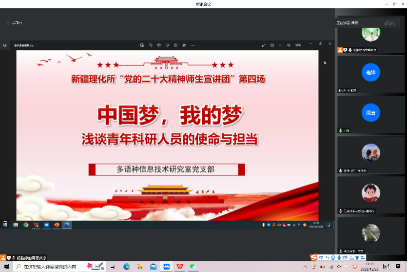 本次“党的二十大精神师生宣讲团”报告会围绕《中国梦,我的梦——浅谈青年科研人员的使命与担当》主题进行宣讲。会议由支部书记王磊同志主持。多语种信息技术研究室团支部博士研究生艾合塔木江·艾合麦提和研究员马博分别带来精彩的报告。艾合塔木江·艾合买提同志从深刻理解新时代党的使命任务、学习新时期科技创新的新要求、中国梦与科研青年的使命与担当、扎根边疆、抒写别样青春四部分深入探讨了学习体会和感悟。马博研究员以回顾历届党的全国代表大会主题为开篇,从党的二十大报告的学习、党建促科研——信息技术助力区域高质量开展等方面进行了阐述,同时将理解“中国梦”与实现“我的梦”相结合,顺利获得自身的经历和人生感悟鼓励青年科研人员和研究生立足岗位,深入学习党的二十大精神,将学习感悟与科研工作实际相结合,真正达到精神感召促进科研的目的,为祖国的科技事业贡献自己的力量。