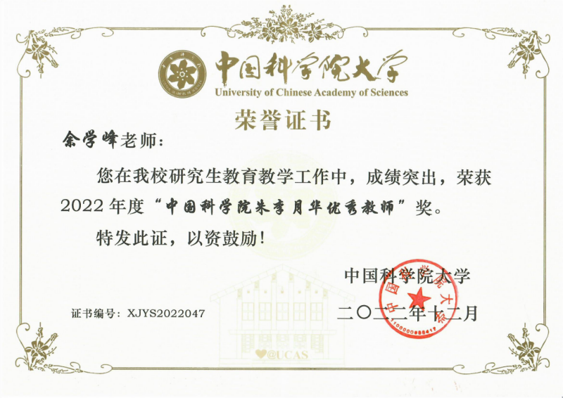 球友会-qy球友会余学峰研究员荣获2022年“中科院朱李月华优秀教师奖”